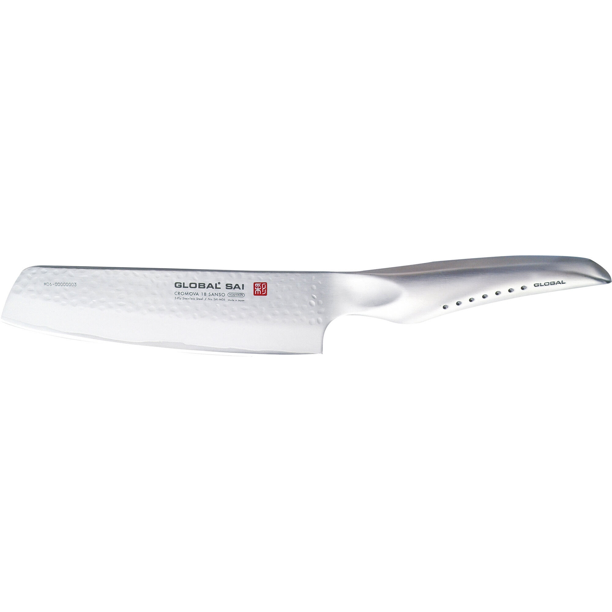 Grøntsagskniv fra Global Sai, der med sit høje og lige blad er ideel til at skære og hakke mindre grøntsager og frugt. Kniven måler 15 cm og har en smal vinkel på 12,5 grader. Skaftet har et ergonomisk tommelfingergreb, og håndtaget på en Global Sai kn